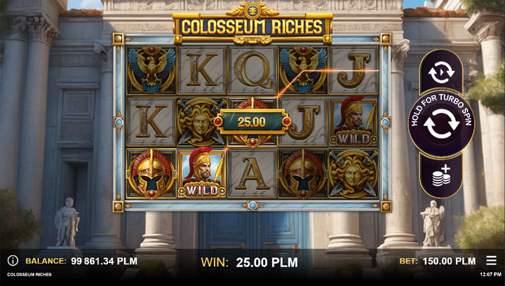 Colosseum Riches เป็น เกมสล็อตโรมัน แบบ 5 วงล้อ 3 แถว มีทั้งหมด 25 เพย์ไลน์ ซึ่งถือว่าเป็นมาตรฐานของเกมสล็อตสมัยใหม่ จุดเด่นของเกมนี้อยู่ที่ ฟีเจอร์สล็อตพิเศษ ที่หลากหลาย ช่วยเพิ่มโอกาสในการชนะรางวัลใหญ่ โดยเฉพาะ Gladiator Battle Bonus ที่ถือเป็นเอกลักษณ์เฉพาะของเกมนี้