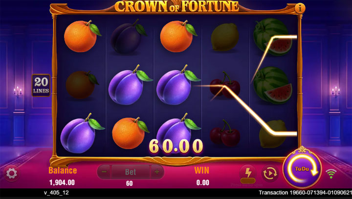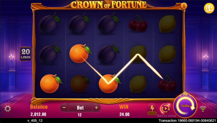 ธีมของเกมหมุนรอบ มงกุฎแห่งโชคลาภ ซึ่งนำเสนอในรูปแบบสล็อตผลไม้คลาสสิก แต่เพิ่มความหรูหราด้วยสัญลักษณ์มงกุฎที่เป็น Wild ขยายตัว วงล้อประกอบด้วย 5 รีล 3 แถว และ 20 เพย์ไลน์คงที่ ซึ่งหมายความว่าคุณมีโอกาสชนะในทุกการหมุนโดยไม่ต้องปรับไลน์เอง สัญลักษณ์หลัก ได้แก่ ผลไม้อย่างองุ่น ส้ม มะนาว แตงโม เชอร์รี่ และระฆัง รวมถึงเลข 7 ที่เป็นสัญลักษณ์จ่ายสูงสุด กราฟิกถูกออกแบบให้ดูหรูหราเหมือนอยู่ในพระราชวัง โดยมีพื้นหลังสีม่วงเข้มและแสงเทียนที่สร้างบรรยากาศลึกลับแต่สนุกสนาน