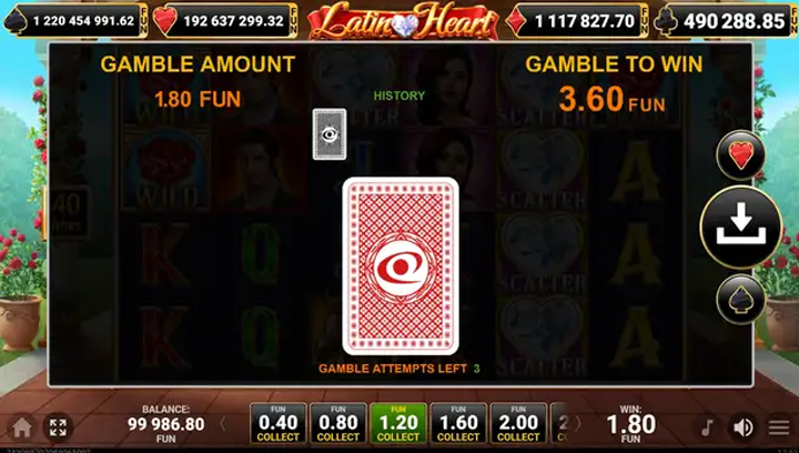 หลังจากชนะรางวัลใดๆ ผู้เล่นสามารถเลือกใช้ฟีเจอร์ Gamble เพื่อเพิ่มเงินรางวัลเป็นสองเท่า โดยการทายสีของไพ่ หรือเพิ่มเป็นสี่เท่าโดยการทายหน้าไพ่