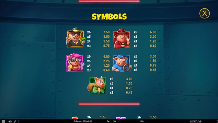สล็อต Piggy Heist มีรูปแบบการเล่นที่ตรงไปตรงมา ผู้เล่นสามารถปรับเงินเดิมพันได้ตั้งแต่ 0.10 ถึง 100 หน่วยต่อการหมุน ทำให้เหมาะสำหรับงบประมาณทุกระดับ สัญลักษณ์หลักประกอบด้วยไพ่ J-A ที่จ่ายต่ำ และสัญลักษณ์หมูตัวละครที่จ่ายสูง โดยการชนะเกิดขึ้นเมื่อสัญลักษณ์เรียงกันจากซ้ายไปขวาอย่างน้อย 3 ตัว ด้วย 4,096 วิธีชนะ ทำให้อัตราการชนะพื้นฐานอยู่ที่ประมาณ 1 ใน 3 การหมุน ซึ่งถือว่าดีสำหรับสล็อตระดับกลาง